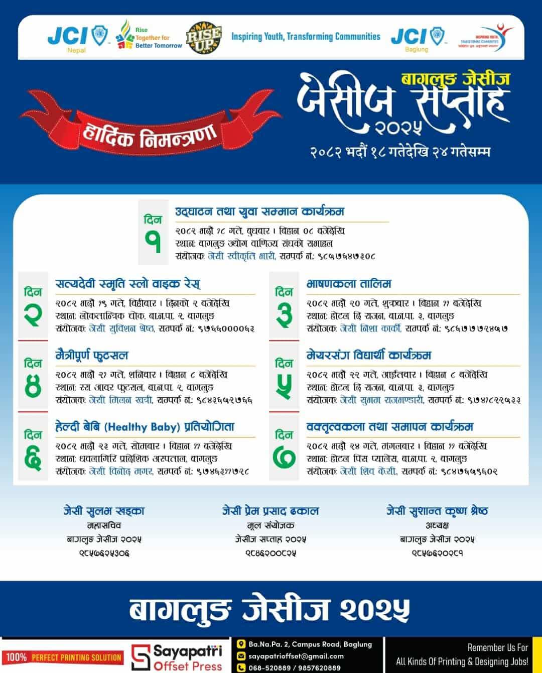 बागलुङ, १७ भदौ । युवाहरुको क्षमता र नेतृत्व बिकासमा सक्रिय बागलुङ जेसीजले यसबर्ष पनि बिभिन्न कार्यक्रमका साथ जेसीज सप्ताह गर्ने भएको छ ।