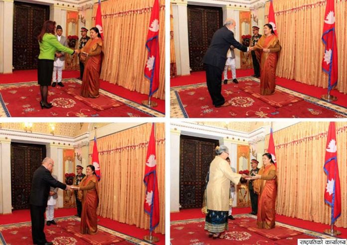 राष्ट्रपति विद्यादेवी भण्डारीसमक्ष विभिन्न चार मुलुकका राजदूतले मंगलबार आ–आफ्नो ओहोदाको प्रमाणपत्र प्रस्तुत गरेका छन् ।